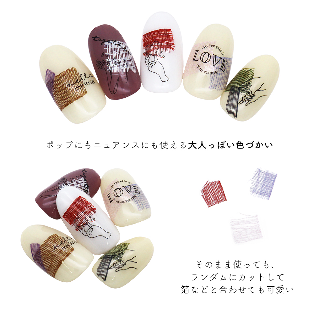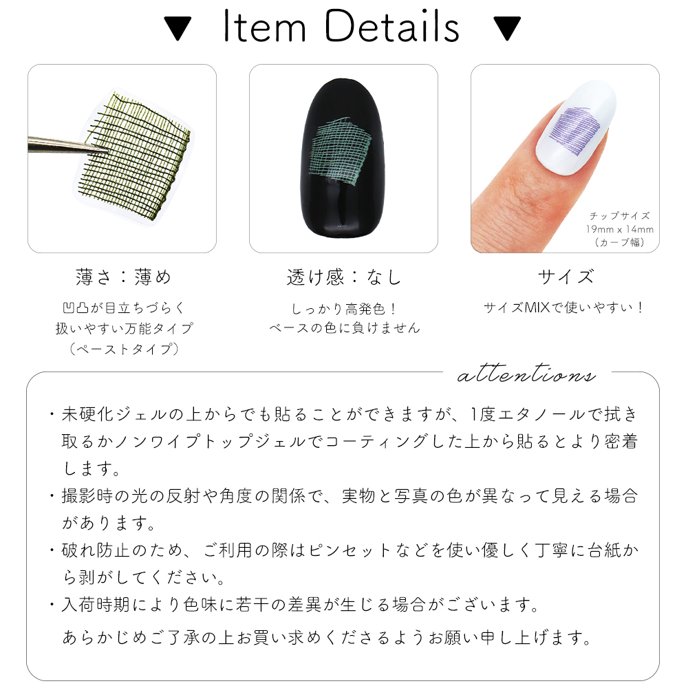 ノンワイプトップジェルでコーティングした上から貼るとより密着します。