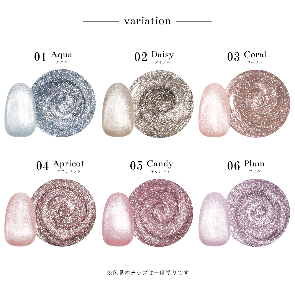・ポリッシュタイプは筆跡が残りやすいため、塗布後筆跡が消えるくらいレベリングするのを待ってからマグネットを当てると綺麗に仕上がります。
