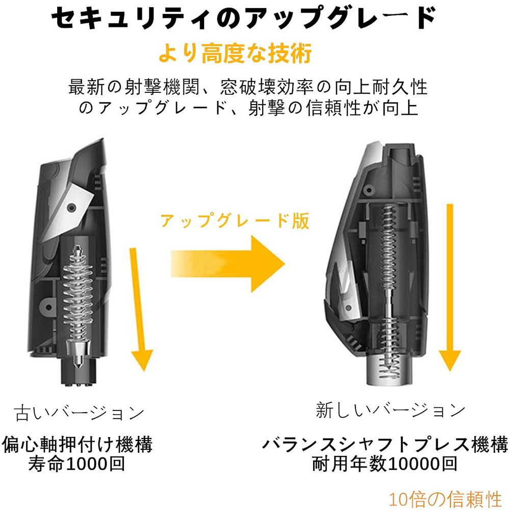 【タングステン鋼素材】PCハウジング付き、ハンマーヘッドはタングステン鋼製、高硬度で変形防止のタングステン鋼ヘッドは、一般的な合金ヘッドよりも長い寿命を保証します。耐用年数:10,000回、ガラスを粉砕することができます。厚さ:8mm、サイズ:83 * 36mm / 3.3 * 1.4インチ。打撃システムは長いホイールベースと正確なストロークを持っています。最大衝撃は78Nです。製品自体はコンパクトで持ち運び可能です。