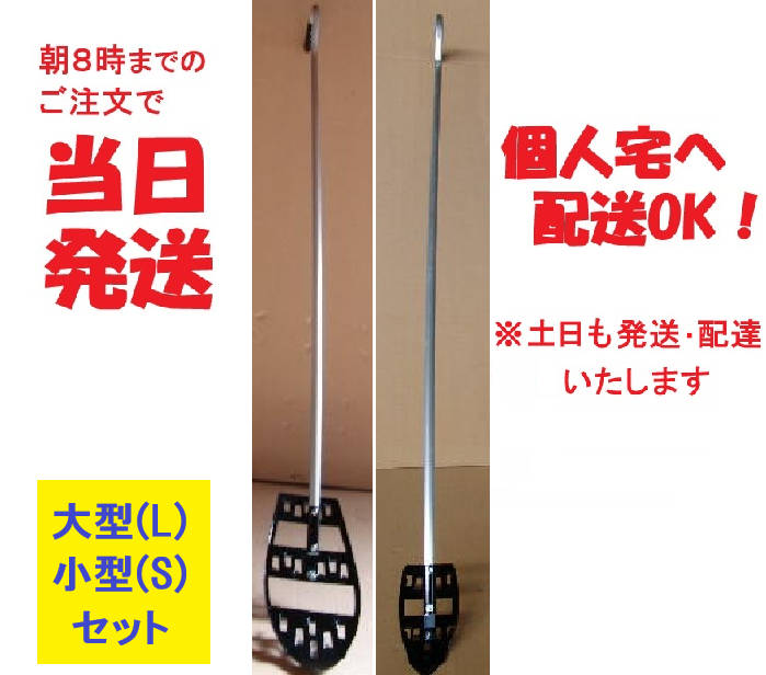 ★★★ 個人宅への配送できます。個人名でのご注文大歓迎です!★★★◆◆◆ 朝8時までのご注文で当日発送!◆◆◆◆◆◆ 土日も発送・配達いたします!◆◆◆【商品説明】はったんどり 大型(L)+ 小型(S)セット 水田用草取り機 軽さを追及した草取り機!腰を曲げない草取り作業は女性やお年寄りへの親切設計!動力除草機(ミニエース)の補助農具として!! ※除草剤を使わない自然農法・無農薬有機農法のために、実施農法の要望により開発した手軽で便利な人力草取り機です。※先端はソリ刃で軽く押すだけ、引く時はテパー爪が雑草をつかんで楽に根から抜き取ります。●枕地内や株間の草取リ作業に効果を発揮します。●高低が多く、部分的に繁茂し過ぎた場所の除草。●除草機(人力・動力)の通らない狭い蛇行した間。 仕様:大型(L) 本体(幅):18cm 長さ:40cm 材質:硬質鉄板 爪の個数:18 高さ調節:ネジ式 柄の素材:アルミ合金製パイプ (ゴムグリップ付) 寸法(長さ):160cm 重量 :1.1kg仕様:小型(S) 本体(幅):12cm 長さ:24cm 材質:硬質鉄板爪の個数:10 高さ調節:ネジ式 柄の素材:アルミ合金製パイプ (ゴムグリップ付) 寸法(長さ):160cm 重量:0.8kg【送付方法 】■個人宅への配送できます。■朝8時までのご注文で当日発送いたします。それ以降は翌日発送。■土日も発送・配達いたします。