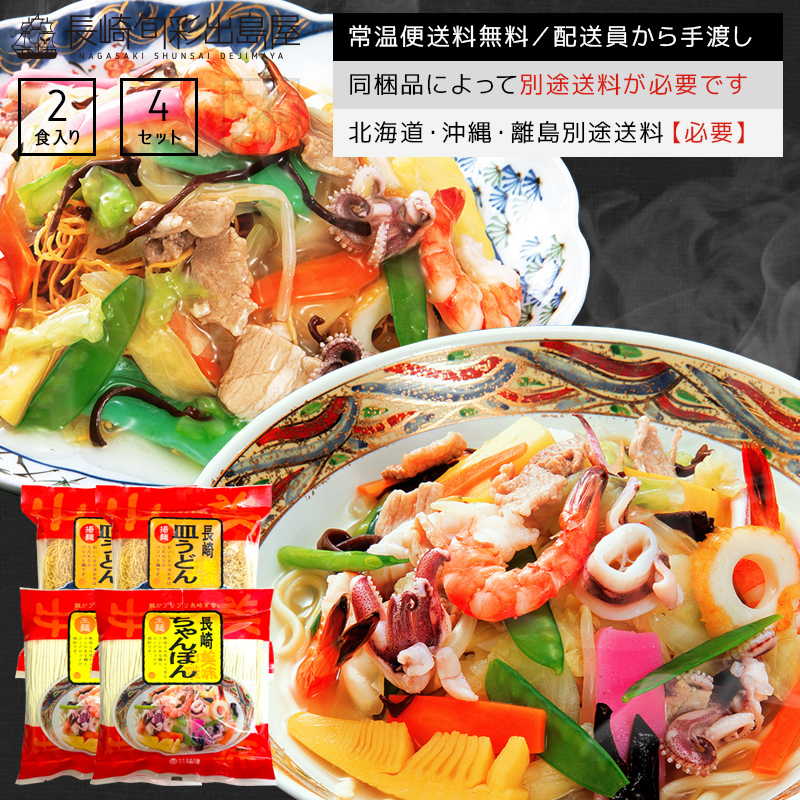 | 内容量 | 長崎ちゃんぽん・皿うどんセット計8人前【ちゃんぽん】260g/2人前(内訳:めん120g×2、スープ粉末10g×2)×2袋【皿うどん】170g/2人前(内訳:めん100g、スープ粉末10g×2、添付調味料25g×2)×2袋 |