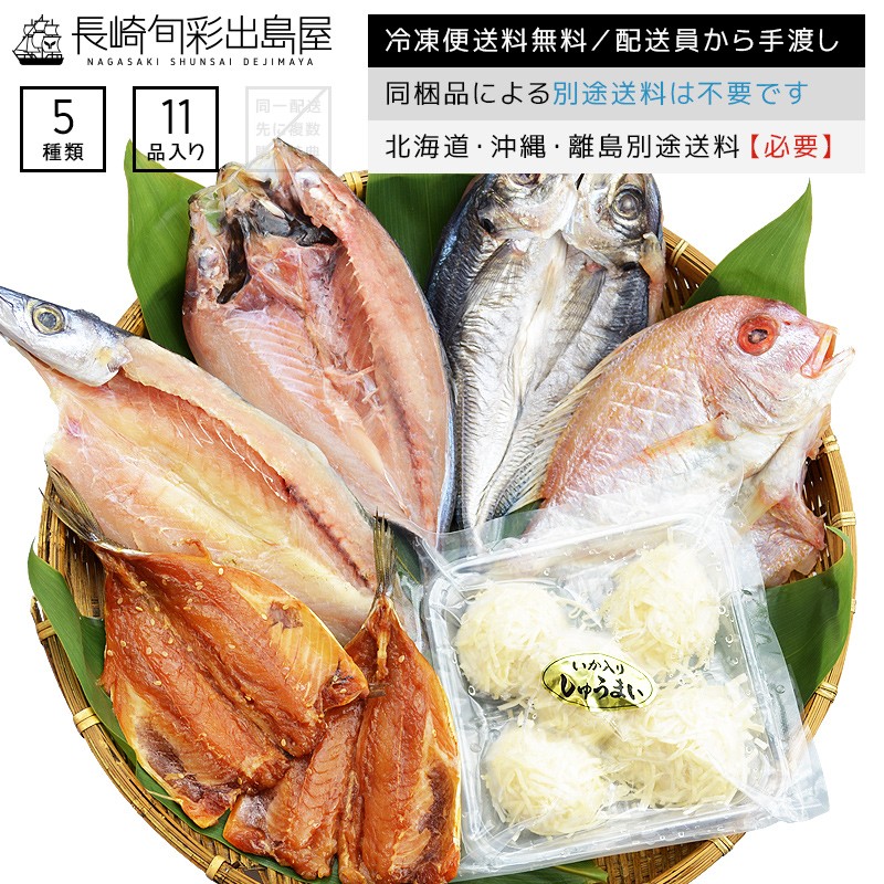 | 内容量 | 【長崎加工】あじ干物[一夜干し/九州産]2枚、かます干物[一夜干し/九州産]1枚、あじ干物[みりん干し/九州産]2枚、連子鯛干物[一夜干し/九州産]1枚、いかしゅうまい5玉 |