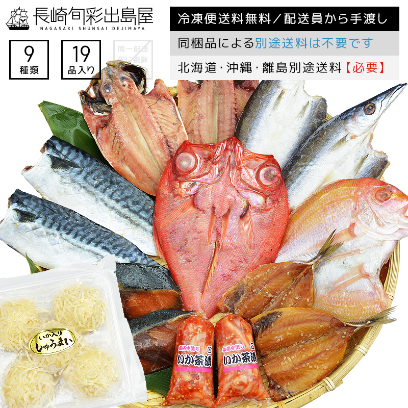 | 内容量 | 【長崎加工】あじ干物[一夜干し/九州産]2枚、かます干物[一夜干し/九州産]2枚、あじ干物[みりん干し/九州産]2枚、ぶり干物[みりん干し/九州産]2枚、ワインさば味醂干し[みりん干し/ノルウェー産]2枚、連子鯛干物[一夜干し/九州産]1枚、金目鯛干物[一夜干し/東北産]1枚、イカ茶漬け70g[惣菜]2個、イカしゅうまい[惣菜]5玉 |