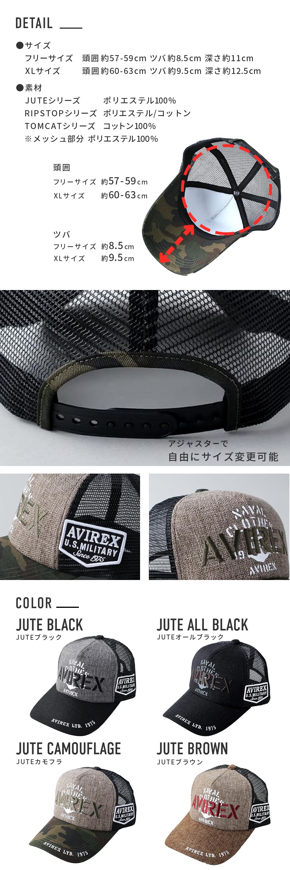 AVIREX (アヴィレックス) スタンダード ミリタリー メッシュキャップ 帽子 キャップ ジュート デニム メンズ 黒 深め 春 夏 ベースボールキャップ ロゴ