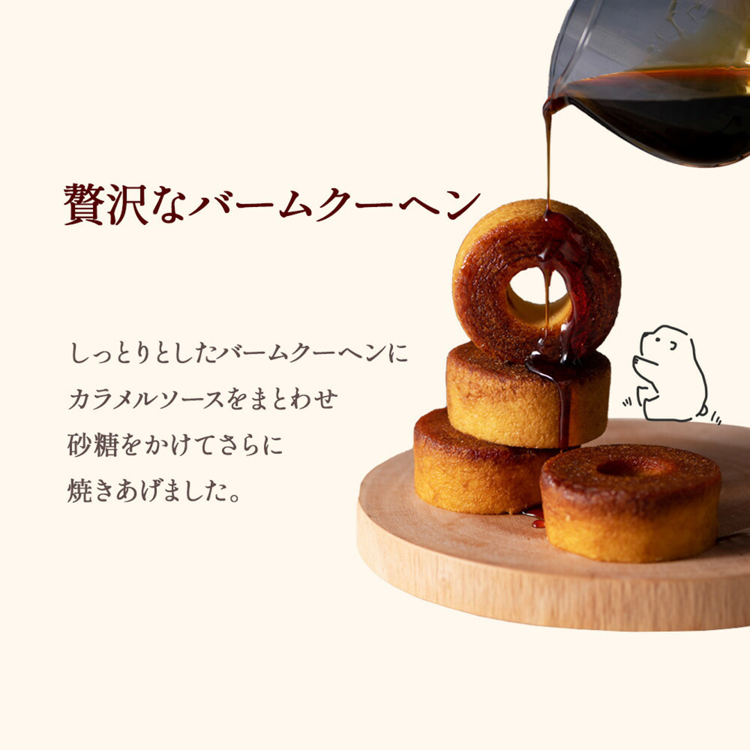 商品内容焦がしキャラメルがしみ込んだバーム×8、しっとりバームクーヘン×6