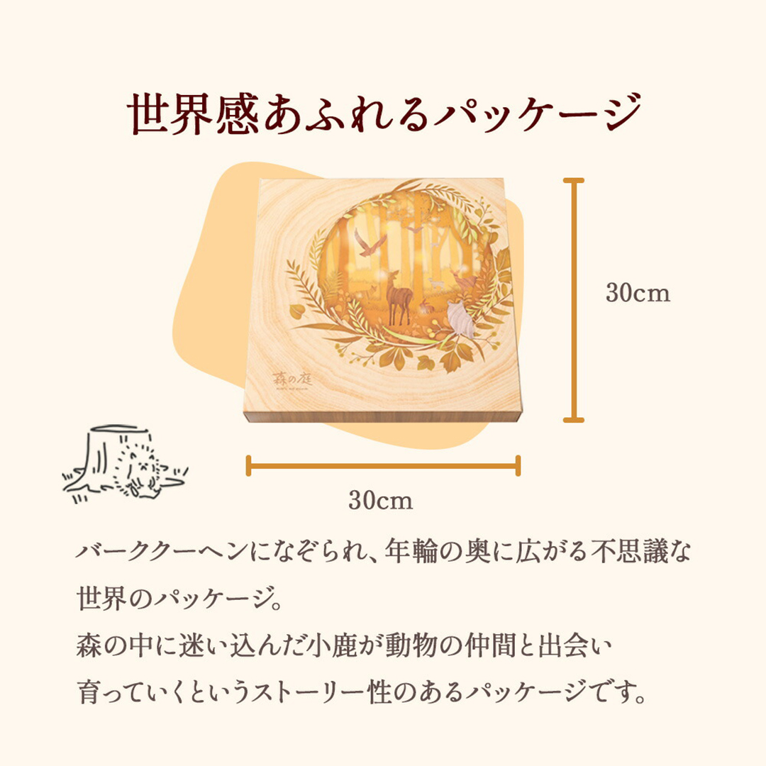 非日常の森の庭で素朴なお菓子を味わう『森の庭』シリーズ。しっとりバームクーヘンにカラメルソースをまとわせ、砂糖をかけてさらに焼き上げた「焦がしキャラメルがしみ込んだバーム」と、「しっとりバームクーヘン」の2種を詰め合わせました。ひと手間かけた味わいをお楽しみください。