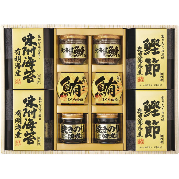 内容量:●北海道産鰊フレーク50g×2、焼きのり入佃煮85g×2、鹿児島県産鰹節(2g×3)×2、有明海産味附海苔(8切10枚入)×2、まぐろ油漬け70g×2