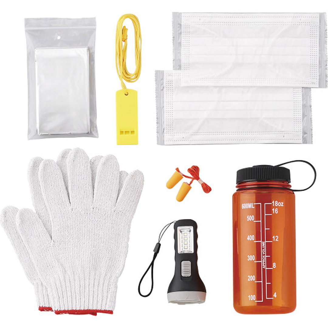商品内容●ボトル(口径=約5.5cm、容量=700ml)・アルミブランケット・軍手・耳栓・ホイッスル・2WAYライト(単3電池×1本使用・別売)×各1、マスク×2
