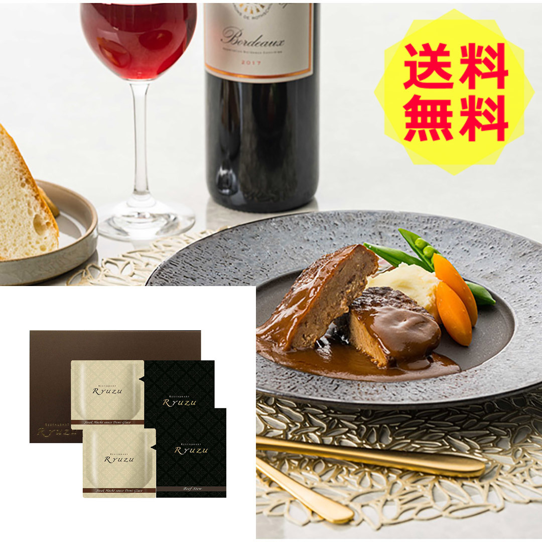 六本木リューズ飯塚隆太シェフが監修する赤ワインとトマト、バターで奥深い味わいに仕上げたデミグラスソースに、温めたときにジューシーさが残るよう軽く焦げ目をつけて焼いたハンバーグと、国産牛肉とぷりぷりのマッシュルームを赤ワインを効かせたデミグラスソースで風味豊かに仕上げた本格フレンチの味わいのビーフシチューの詰合せ。