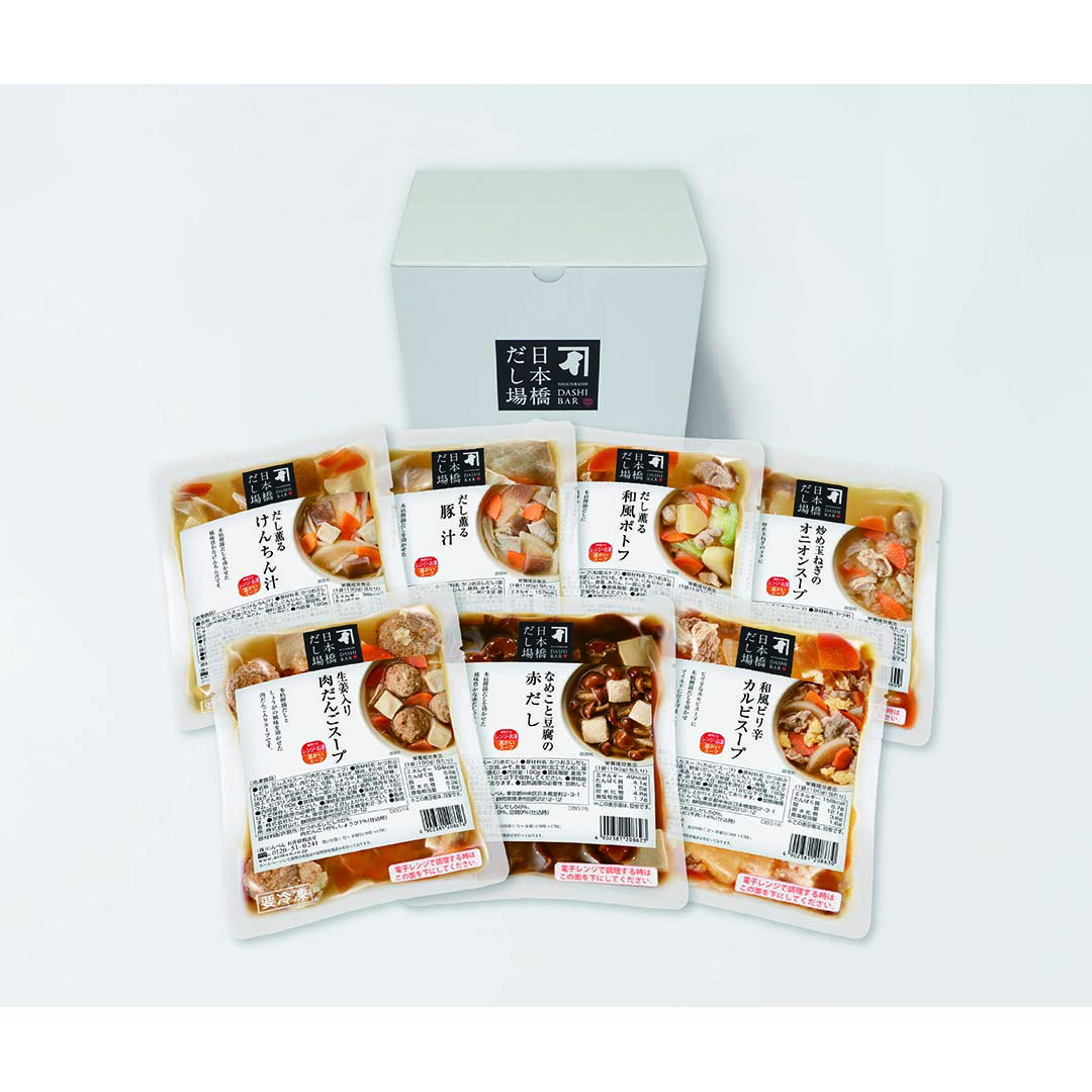 商品内容(だし薫る和風ポトフ、だし薫るけんちん汁、だし薫る豚汁、なめこと豆腐の赤だし、和風ピリ辛カルビスープ、炒め玉ねぎのオニオンスープ、生姜入り肉だんごスープ)×各1 計7