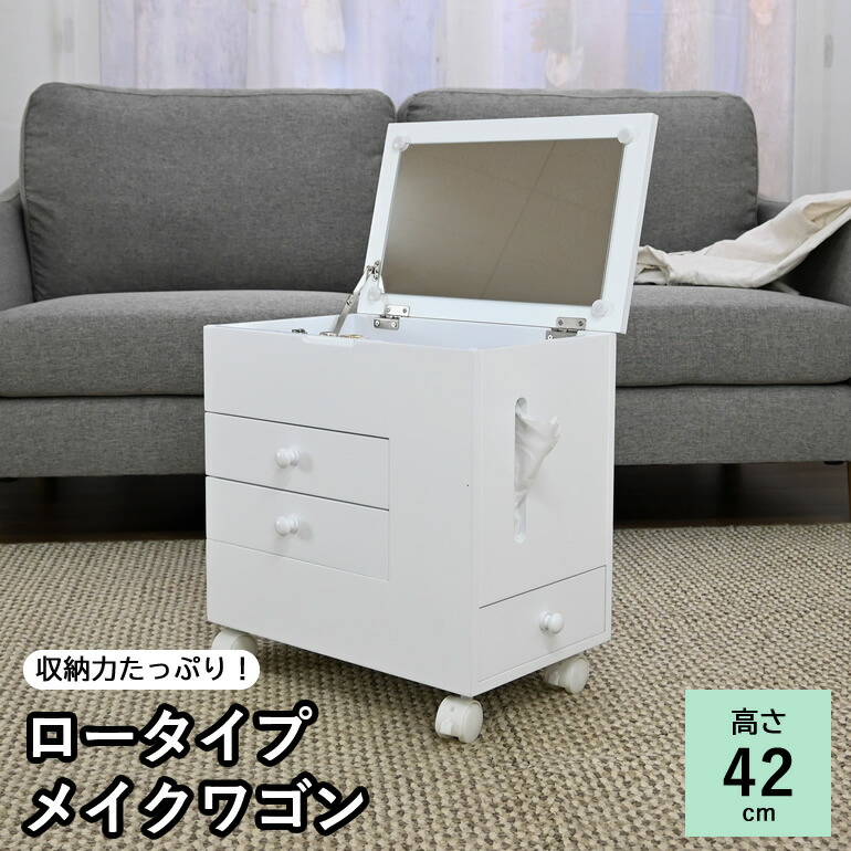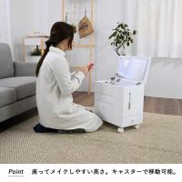 | ●収納力たっぷり!大型ドレッサー要らず。 ●キャスター付きなのでお好きな場所へ移動が楽々。 ●収納面は引出×3杯(正面×2・側面×1)・天板を開けると小物収納・ティッシュ収納(深さ約21cm)。 ●天板を閉じればちょっとしたサイドテーブルに。コンパクトサイズなので、リビング・お部屋でも邪魔になりません。 |
