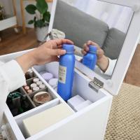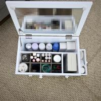 | [本体]:約幅40×奥行27.5×高さ42cm [梱包]:W43.5xD29xH40cm [各サイズ]:引出3杯(正面×2・側面×1) 収納(大)内寸:約幅37×奥行8×高さ21cm 収納(中)内寸:約幅27×奥行12×高さ5cm 収納(小)内寸:約幅8×奥行12×高さ21cm 本体前引出内寸:約幅25×奥行11×高さ5cm×2 側面引出内寸:約幅20×奥行27×高さ6cm キャスター高:約5.5cm 取っ手:約3.5cm つまみ:約2cm ミラーサイズ:約幅34×高さ19.5cm [材質]:MDF・ミラー・キャスター [重量]:9.2kg(梱包重量:9.9kg) [取っ手・つまみ・キャスターのみお客様取付] |
