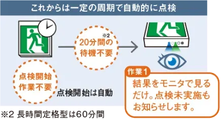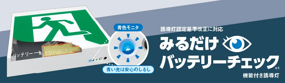 ※1「 みるだけバッテリ―チェック」とは、JIL5502:2025「誘導灯器具及び避難誘導システム用装置技術基準」に規定する「周期始動方式自動点検」を指します。