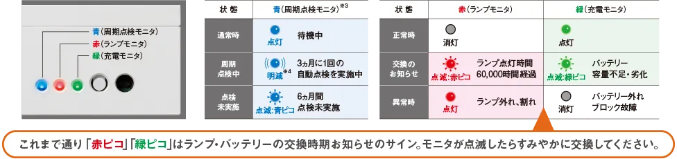 6ヵ月間点検が実施されていない場合は、青色の周期点検モニタ※3が点滅して点検未実施をお知らせ。 点検漏れが一目でわかります。