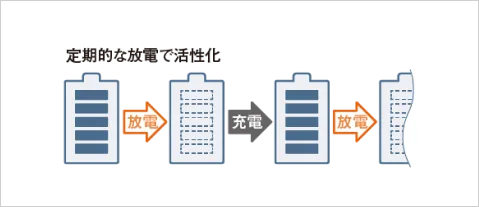 バッテリーは定期的な放電で活性化され、適正な状態で使用することができます。新たな点検方式では6ヶ月以内に1回自動で放電を行うので、万が一の災害時に備え元気な状態を保つことができます。