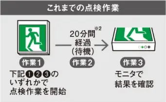 これまでは①ブレーカーの遮断②点検スイッチ③リモコンの操作により点検を開始していたものが、これからは器具が自動で点検を開始。結果をモニタに表示するので、みるだけでバッテリーの状態確認をすることができます。 ※従来の点検方法でも確認いただけます。