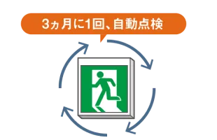 消防法で定められている定期点検「6ヵ月に1回」に対して、「みるだけバッテリーチェック」機能は3ヵ月に1回、自動で蓄電池により誘導灯を点灯し、点検を実施。定期的に放電が行われることで蓄電池の性能維持につながります。