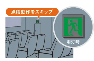 劇場や映画館など利用形態により誘導灯を点灯させたくないケースでは、消灯信号を受けることで自動的に点検動作をスキップします。 消灯信号を受けなくなれば、再度点検動作を行います。