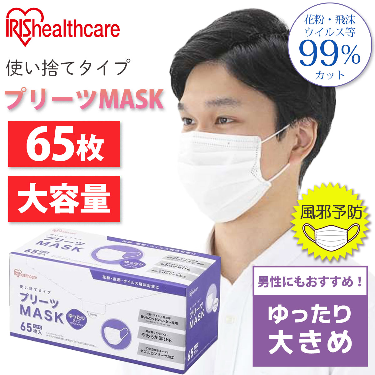 PN-NV65LL アイリスオーヤマ (IRIS OHYAMA) 不織布 プリーツマスク ゆったり大きめサイズ 1箱(65枚入)