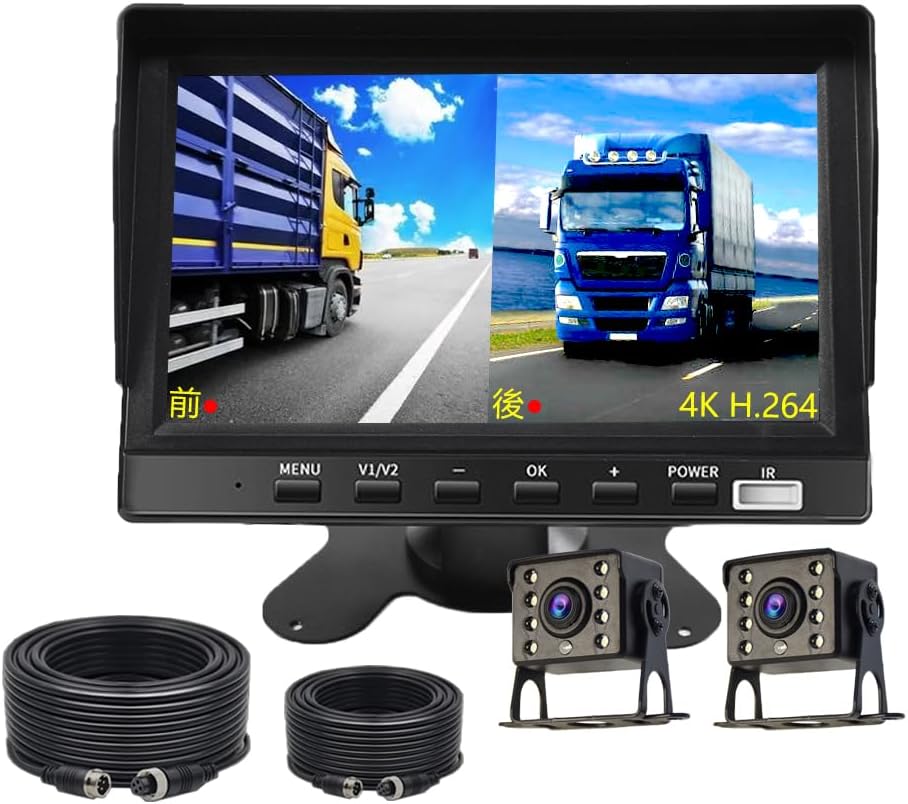 バックカメラ*2台付属しております。AHDカメラは従来のアナログカメラの約2倍もの高画質での監視が可能になります。さらにIP68防塵防水構造で雨天に濡れても問題ありません。【前後の死角をなくす】モニターは最大同時にカメラ2個分の映像を確認することが出来ます。