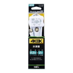 【仕様】 ●新4K8K衛星放送受信を含むすべての放送に対応したケーブル付き分波器です。<br>●ケーブルは細く(2.5C)、やわらかいので狭いテレビの裏でもすっきり配線ができます。<br>●電波法の技術基準に該当する帯域の漏洩電界強度に対応したJEITAのSHマーク登録品です。<br>●RoHS2の特定有害10物質の確認ができたECOマーク対応品です。<br>●屋内用ケーブル付分波器<br>●色:白<br>●ケーブル長さ(?):入力2.0 出力0.2<br>●本体寸法(?):34×45×22(突起部含まず)<br>●質量:125?(入力ケーブルを含む)<br>●パッケージ寸法(?):200×50×45<br>●CS/BS電流通過型<br>●出力:L型プラグ<br>●出力:F型コネクタ<br>●入力2?ケーブル付属<br>●サイズ(?):200×50×45<br>●質量(1):1