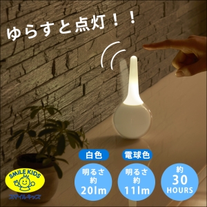【仕様】 ●揺れるとセンサーが反応して点灯する防災とインテリアが融合した新時代のライト。点灯して、揺れが止まってから約30秒後に自動消灯し電池の消耗を押さえます。非常時には内部スイッチの切り替えで連続点灯できます。灯りの色は白色と電球色の2種類を切替可能です。