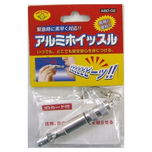 【仕様】 携帯に便利で丈夫なアルミホイッスルです。閉じ込められた時や声が出せない緊急時に大きな音で助けを呼ぶ事が出来ます。中には個人情報を書き込める紙(IDカード)が入っており怪我を負った際にはIDカードを渡せば手短に「血液型、住所、氏名、連絡先」など必要な情報を伝えることが出来ます。