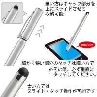 【仕様】●メーカー:サンワサプライ ●型番:PDAPEN27SV ●商品名:タッチペン ●スマートフォン・タブレット対応 ●静電容量方式 ●ペン先2種類(太・細) ●カラー:シルバー ●長さ(mm):124(クリップ部除く) ●直径(mm):8.5 ●ゴム部直径(mm):太い側 8、細い側 5 ●重量(g):18 ●細い側:スライド収納可能 ●クリップ付 ●対応機種:静電容量方式、感圧式、光学式タッチパネルを持つ機種 ・各社スマートフォン、タブレット、電子書籍、ブックリーダー、eBookなど