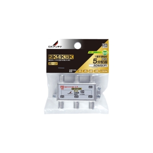 【仕様】 ●4K8K衛星放送(3224MHz)対応の、アンテナからの入力信号を均等に五つに分けることができる5分配器です。<br>●一つの出力端子のみ電流(DC15V・0.8A以下またはAC30V・1A以下)が通過する、1端子通電形。<br>●ノイズに強いダイカスト構造。<br>●JEITA SHマーク認証済み。<br>●パック入り商品。<br>●品名:5分配器<br>●型番:5DMS(P)<br>●周波数帯域(MHz):10〜3224<br>分配損失(dB以下)<br>●10〜76MHz:9.5<br>●76〜222MHz:9.2<br>●222〜770MHz:9.7<br>●770〜1489MHz:10.5<br>●1489〜2150MHz:12.5<br>●2150〜2681MHz:14.0<br>●2681〜3224MHz:16.3<br>端子間結合損失(dB以上)<br>●10〜76MHz:15.0<br>●76〜222MHz:20.0<br>●222〜770MHz:18.0<br>●770〜1489MHz:15.0<br>●1489〜2150MHz:15