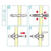 【仕様】●メーカー:ユニカ ●型番:B412 ●商品名:ボードロック ナベ頭+-兼用タイプ ●はさみ固定式 ●ヘッド形状:ナベ頭(+-兼用) ●使用ねじ径:M4 ●外径(mm):6.8 ●全長(mm):36.5 ●ねじ首下長(mm):43.5 ●適応板厚(mm):9〜13 ●下穴径(mm):9.0 ●最大引抜強度(kN): ・ベニヤ板(4.0mm):1.06(アンカー抜け) ・石膏ボード(9.5mm):0.78(母材破壊) ・石膏ボード(12.5mm):0.88(母材破壊) ●材質:スチール/ユニクロ処理 ●入数(本):40 ●適合材:中空構造壁 《施工方法》 (1)規定の下穴径で穴あけします。 (2)ボードロックを差し込み、ねじを締め付けます。 (3)ねじをゆるめて、一旦取り外します。 (4)器具をはめ込み、ねじを締め付け施工完了です。 【ご注意】 ※施工時は必ず、安全メガネ、ヘルメットなど保護具を着用してください。 ※下穴は規定のドリル径で対象面に直角に穴あけしてください。 ※穴あけ時に反対側の壁を傷つけないよう注意してください。 ※ボード厚と取付物厚を考慮したアンカーサイズを選定してください。