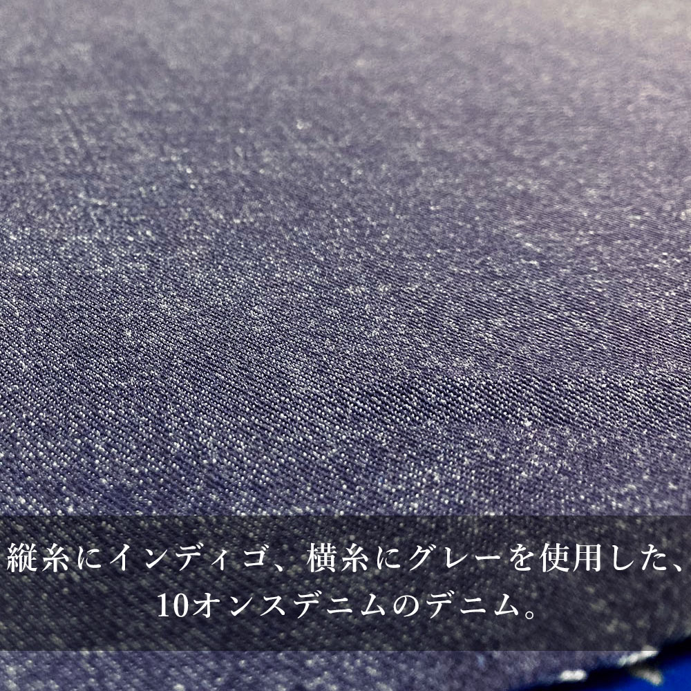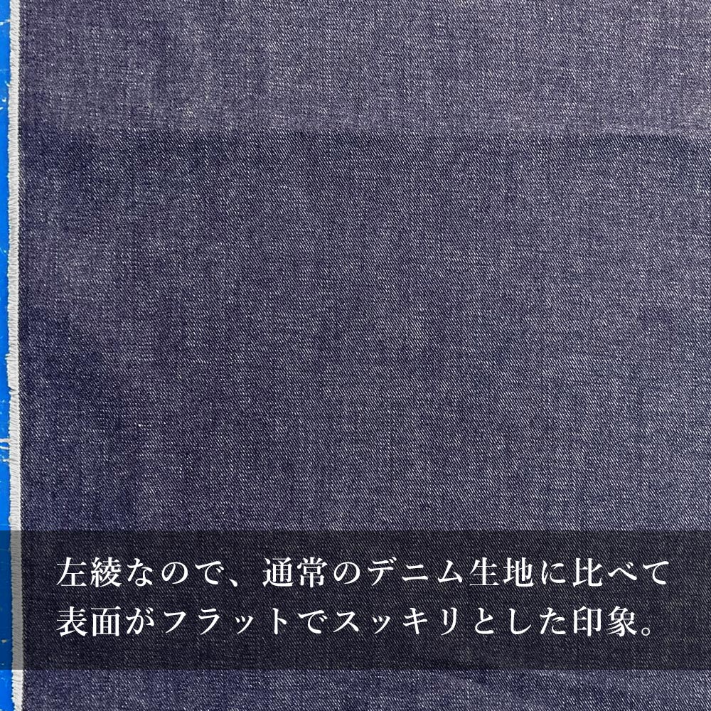 左綾なので、通常のデニム生地にくらべて表面がフラットで、見た目がスッキリとした印象の生地。