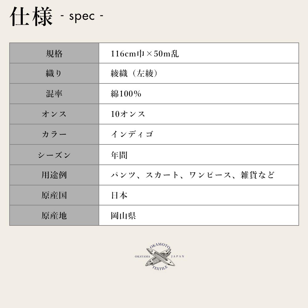デニム生地 生地 デニム 10オンス 116cm幅 左綾 綿 コットン100% ロープ染めデニム インディゴ 岡山デニム 井原デニム 国産 布 布地 ヴィンテージ ジーンズ 古着