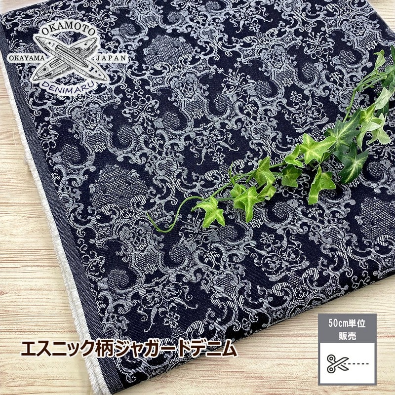 デニム エスニック柄ジャガードデニム ダマスク アラベスク 9オンス 綿 コットン 100% デニム生地 岡山デニム ジーンズ ジャガード