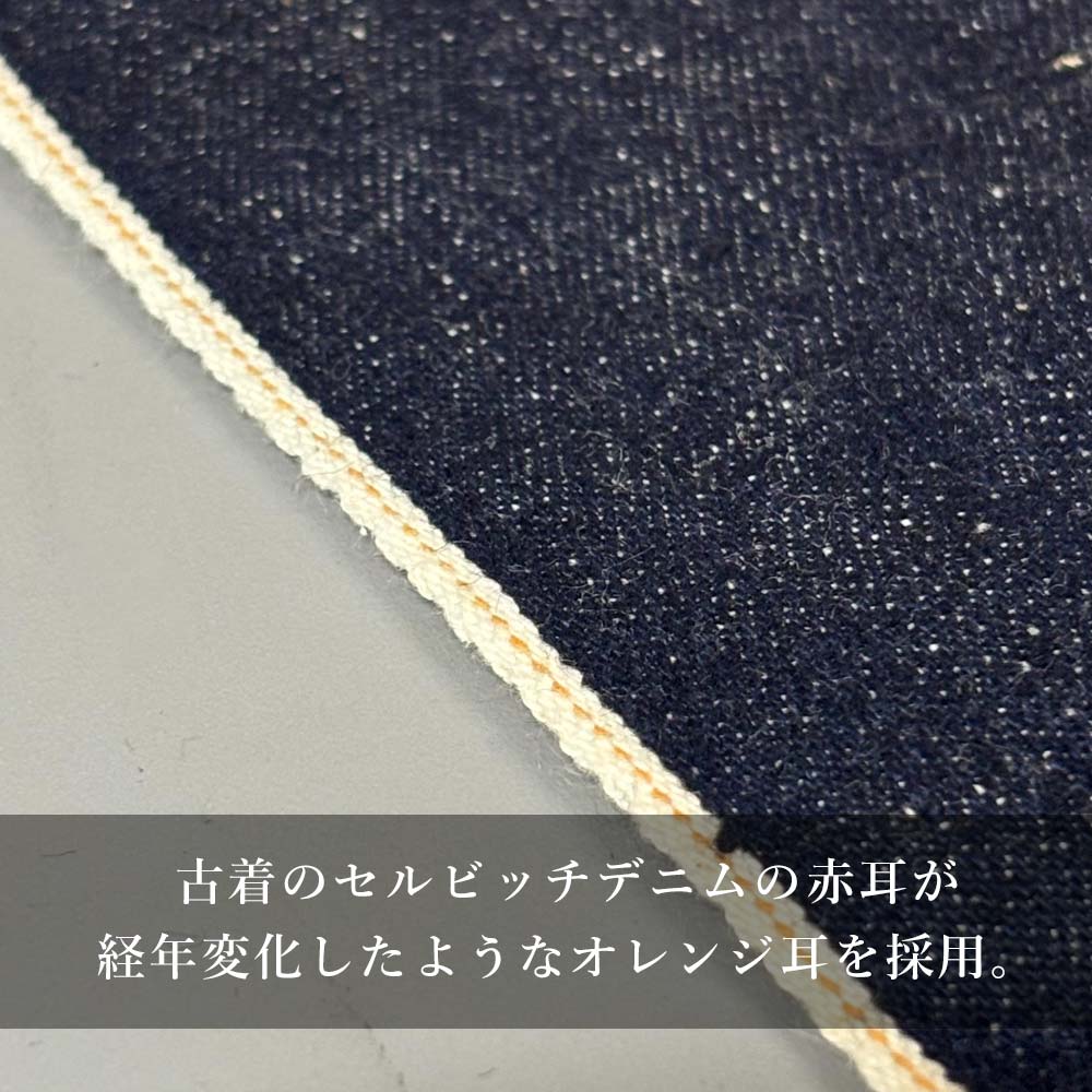 セルヴィッチ特有の両サイドの耳は、古着のセルビッチジーンズの赤耳が経年変化したようなオレンジ耳を採用。
