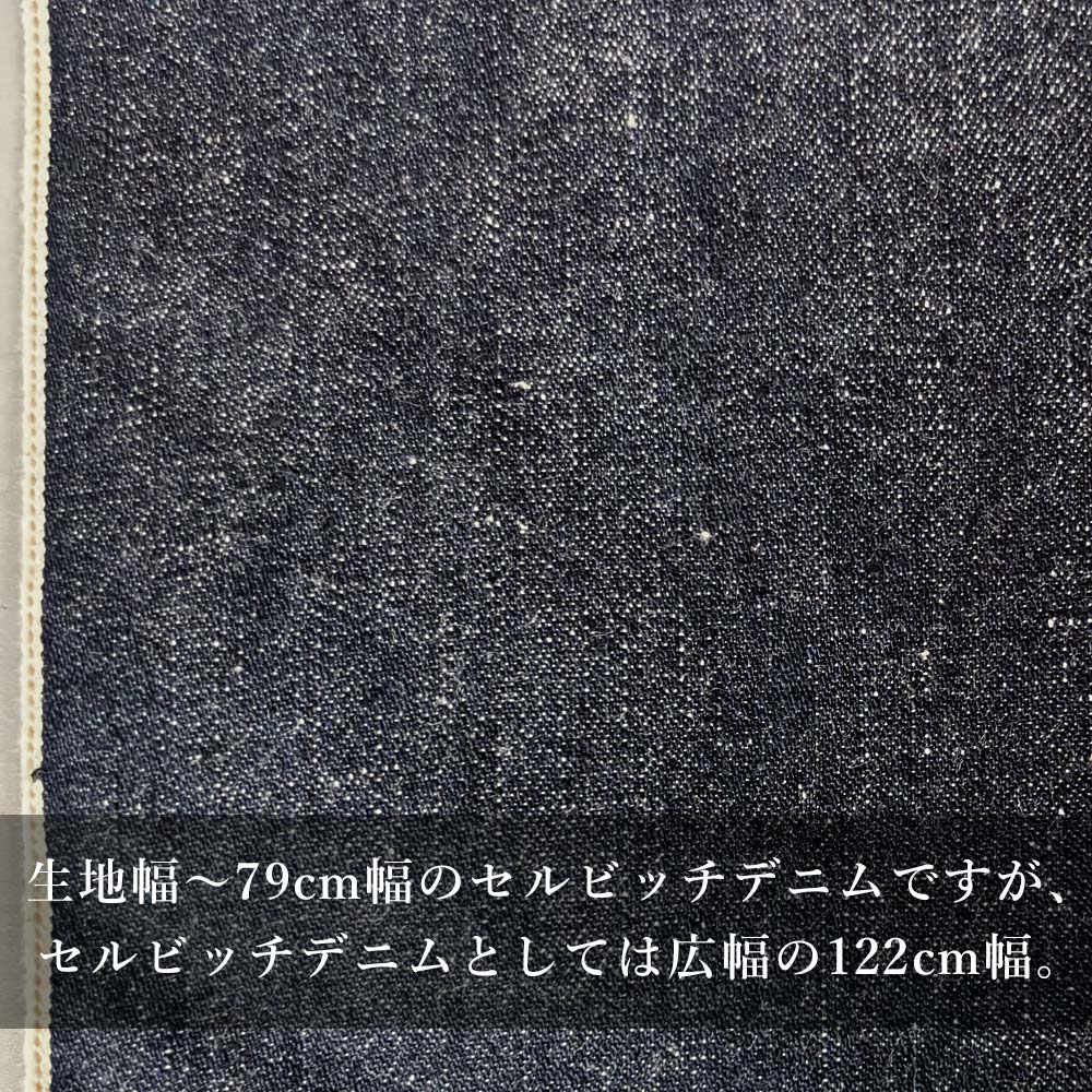 通常のセルビッチデニムが大体〜80cmくらいの生地幅に対して、こちらは122cmの広幅セルビッチとなります。
