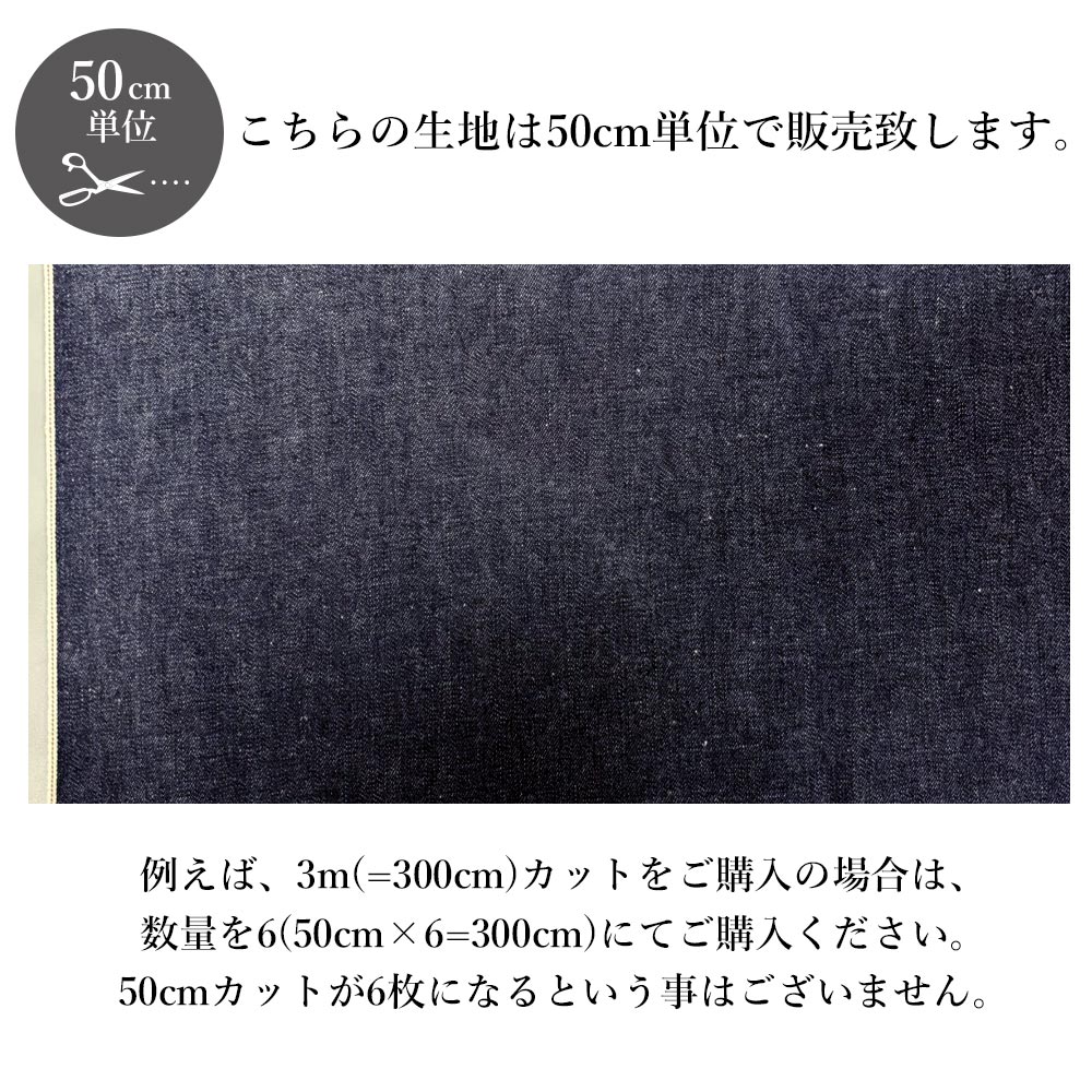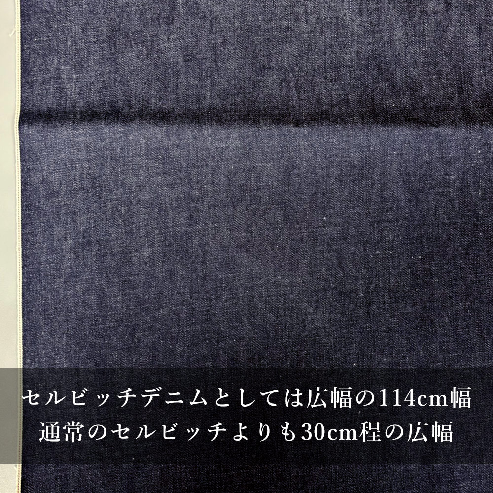 セルビッチデニムとしては広幅の114cm幅で、10オンスのライトオンス部類のセルビッチデニム。