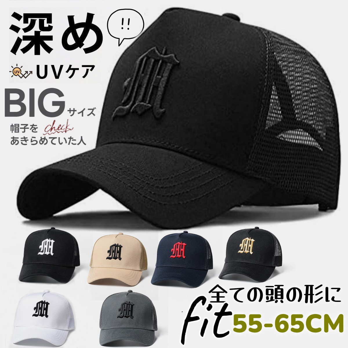 頭の形にぴったりフィットする、ビッグサイズのメッシュキャップが登場!頭囲58〜65cmまで対応し、「帽子が似合わない」と感じていた方にもオススメです。深めの設計でしっかり顔周りをカバーし、UVカット率は驚きの99.9%。日差しが強い季節でも安心して着用いただけます。