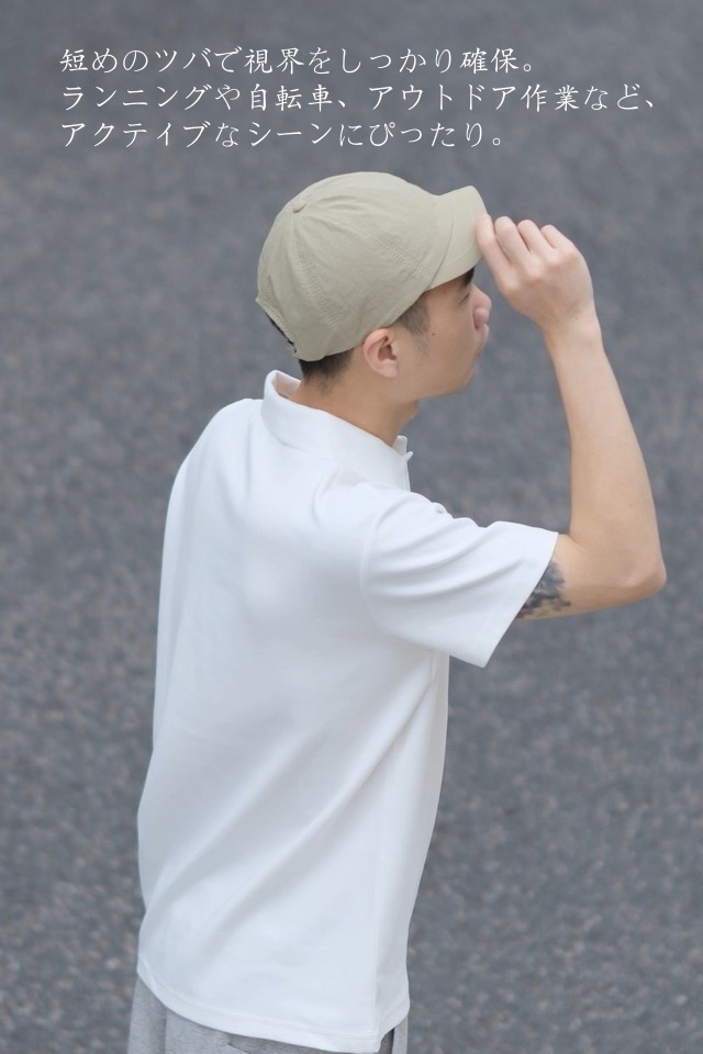 短めのツバ(約3cm)は視界を遮らず、日常使いからランニング・自転車・ハイキング・キャンプなどのアクティブシーンにも最適。