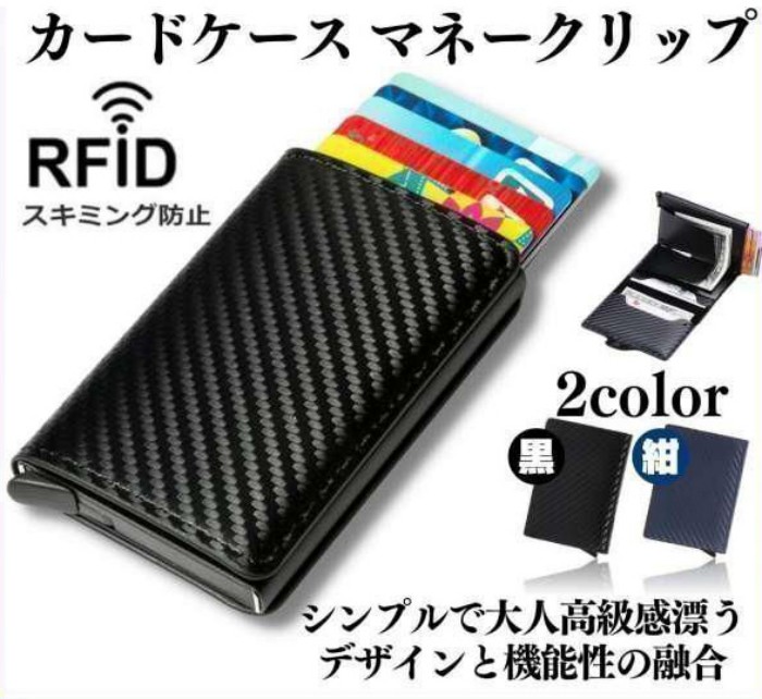 カードケース マネークリップ メンズ レディース スライド式 カーボン調 クレジットカード収納 軽量 コンパクト 二つ折り RFIDスキミング防止 黒