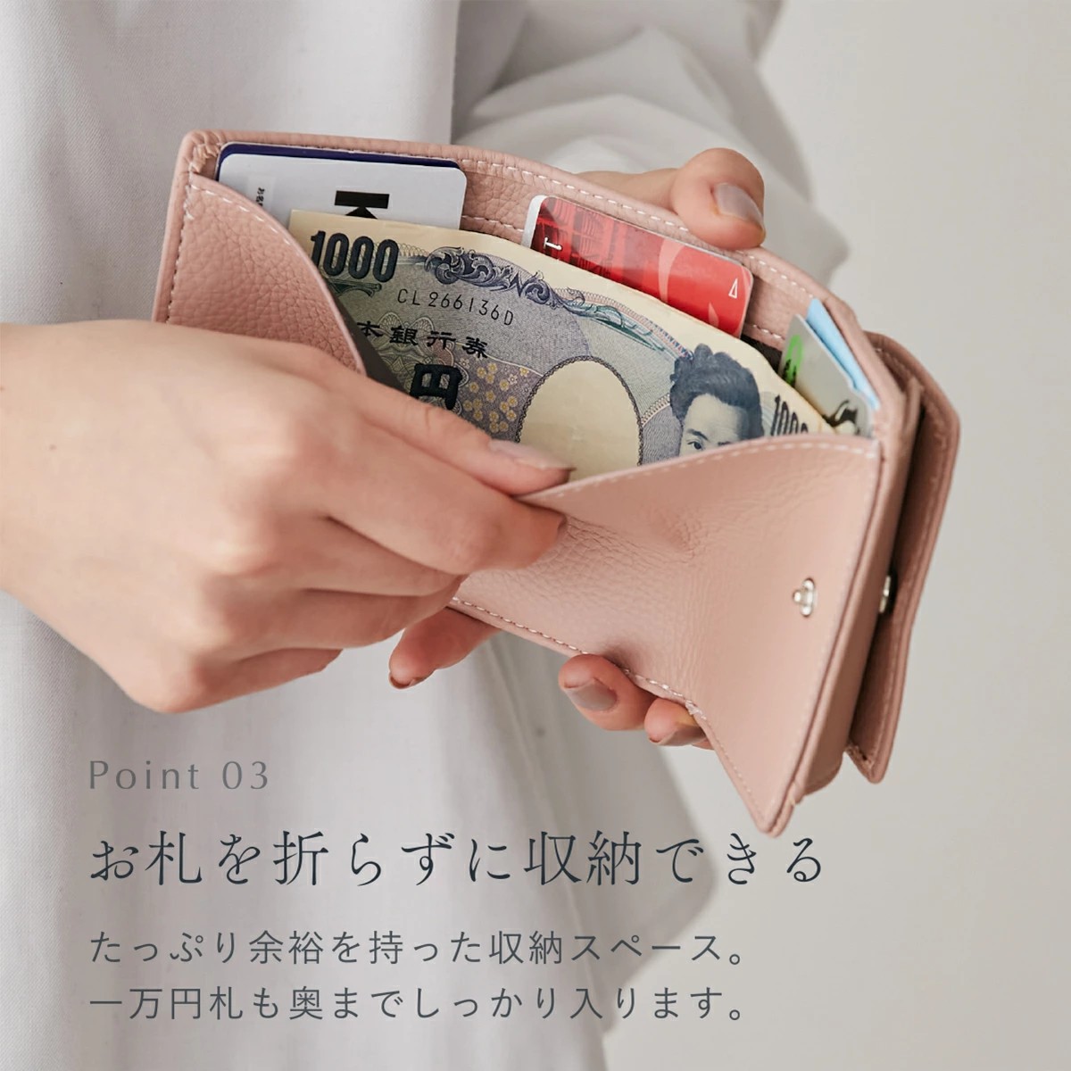 手のひらサイズで持ちやすい、上品デザインの三つ折りミニ財布。