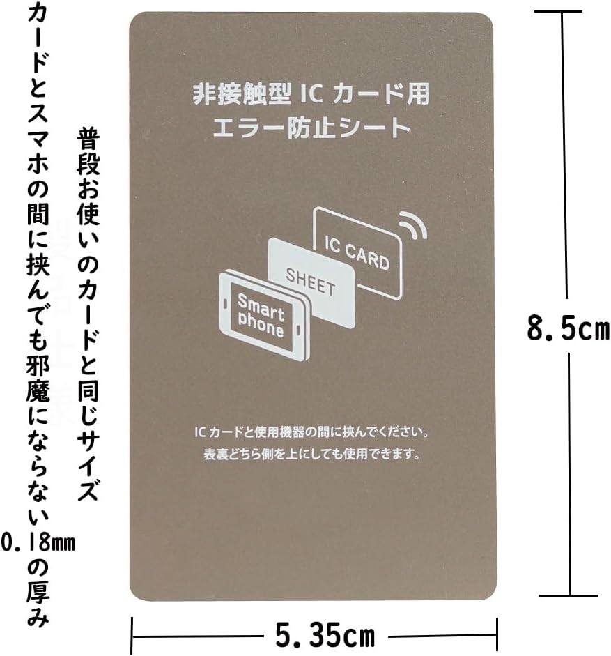スマホとICカードの同時使用時にエラーを防ぐ、超薄型0.2mmの電磁波干渉防止シートです。特に、SuicaやPASMOなどの非接触型ICカードをスマホケースに一緒に入れた際に発生するエラーを防止します。このシートはICカードとスマートフォンの間に挟むだけで、磁気干渉や電磁波の影響をシャットアウトします。