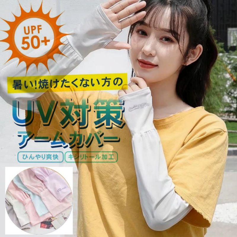 【商品仕様】:UVアーム袖丈49cm、上部袖口9.5cm、下部袖口8.5cm、適した手囲い:17〜22cm、4色展開:ピンク、グレー、ブラック、ホワイト