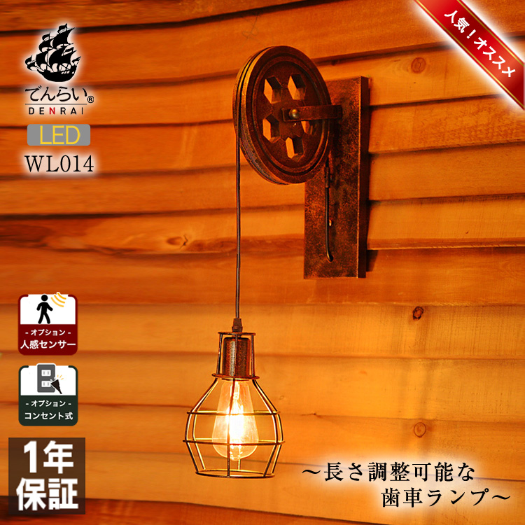 木の滑車にアイアンガードがぶら下がった、個性的なブラケットライト。