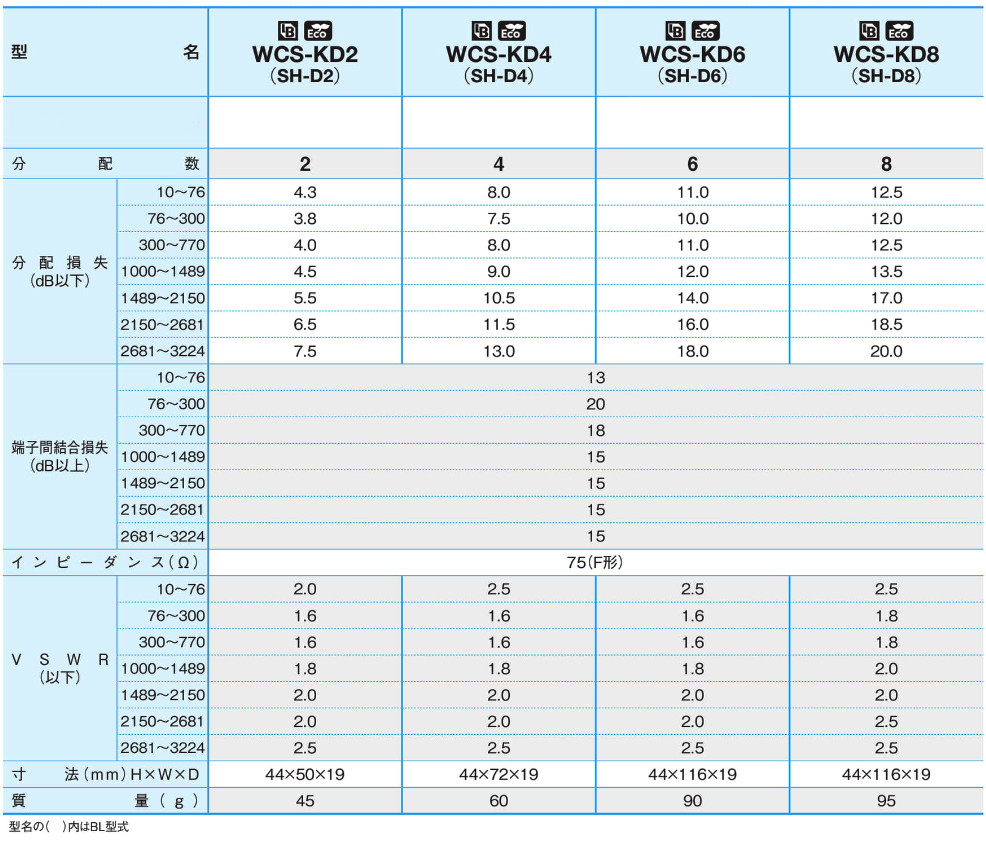 ・新4K8K衛星放送受信に対応した10〜3224MHzまでの超広帯域設計です。・亜鉛ダイカストの一体型筐体を採用した高シールド設計になっている為、妨害波の影響を受けにくい仕様となっています。・芯線接触部分は金メッキ仕様になっていますので、高い信頼性を有しています。・全端子電流カット型です。