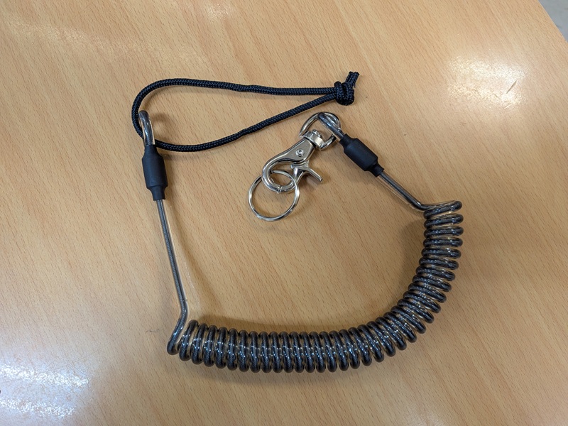流れ止めです。足につける輪とコードが金具で外せるので、ゴンドラ乗車時に便利です。かなり伸びますので、スクートが自分に降って来ることは、めったに無いと思います