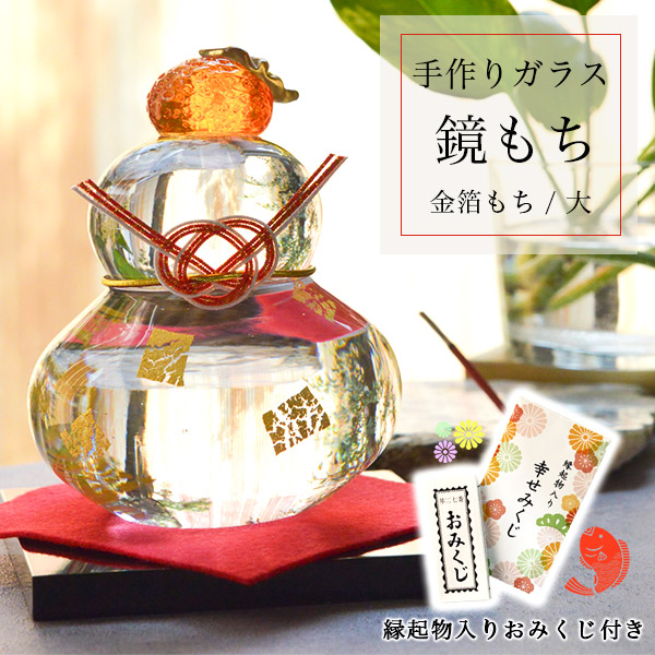 鏡もち 金箔 大サイズ 縁起物入りおみくじ付き ( あすつく お正月 新年 ガラス 置物 正月 縁起物 インテリア 鏡餅 かがみもち 周年 創立 上場 竣工 開店 )