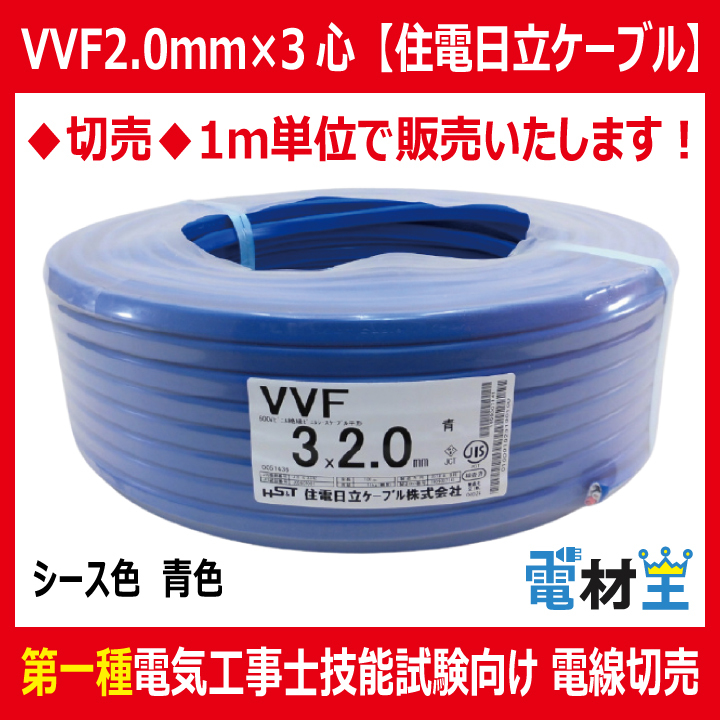 切売 VVF 2.0mm×3心 600Vビニル絶縁ビニルシース電力ケーブル平形 青 青色 住電日立ケーブル