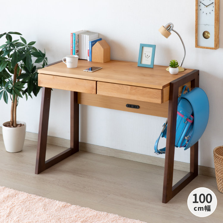 STEPシリーズの100cm幅の学習デスクです。ナチュラル色の天板とダークブラウンの脚部、2色のカラーリングがおしゃれな木製デスク。お子様の成長に合わせて6cmピッチ4段階で調節できる勉強机。 引出収納は2杯付き。コンパクトサイズながら収納力抜群です。文房具を収納するだけでなく、A4サイズやB4サイズも入るので学校のプリントやファイル類、ノートや冊子もしまえます。 学習机としてだけでなく、PCデスクやオフィスデスク、大人の書斎デスクにも最適。 シリーズにはキャスター付きのワゴンや可動タイプの仕切り板が付いたブックスタンドも展開中です。テイストが同じ家具でデスク周りを揃えれば、お部屋に統一感が生まれいっそう快適な学習環境に。