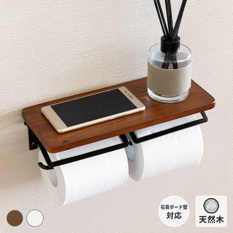 トイレットペーパーホルダー ツインタイプ 2連 棚付2連紙巻器 ストック 収納スペース ディスプレイ パイン材 アイアン トイレ 長尺トイレットペーパー 無垢材 棚付き |