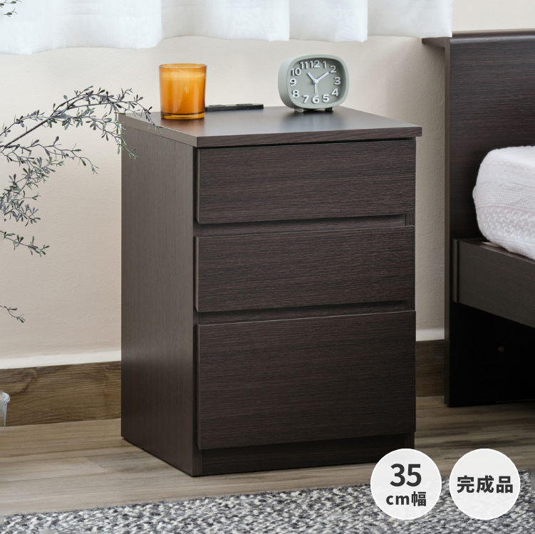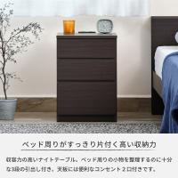 オススメ 大人の雰囲気を感じるコンパクトサイズのナイトテーブル。シックでモダンな印象のダークブラウンは、世代を超えて人気の高いカラーです。ベッド周りの小物を整理するのに十分な引き出しを3段備えました。天板には充電や照明に便利なコンセントを設置。引き出し内部にブラックシートを使うことで本体色(DBR)との統一感を持たせています。